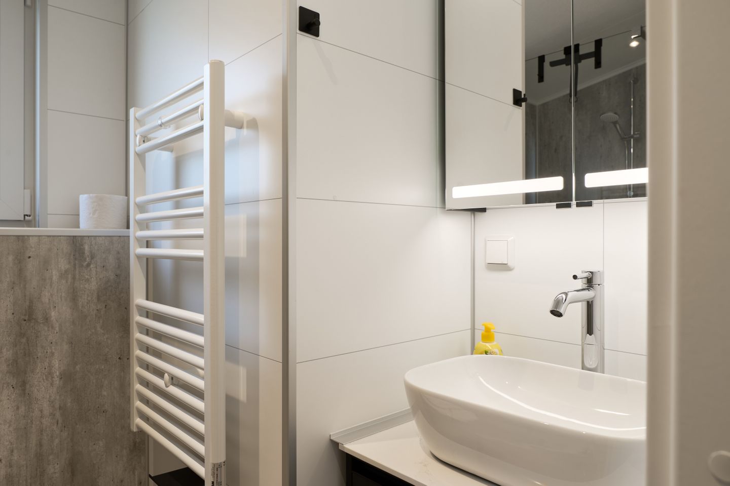 Das Badezimmer bietet eine bodengleiche Dusche, WC, Waschbecken, Spiegel, Haartrockner und Tageslicht. Für einen angenehmen Aufenthalt sorgen wohnliche Extras wie Heizung, warmes Wasser und Rauchmelder.