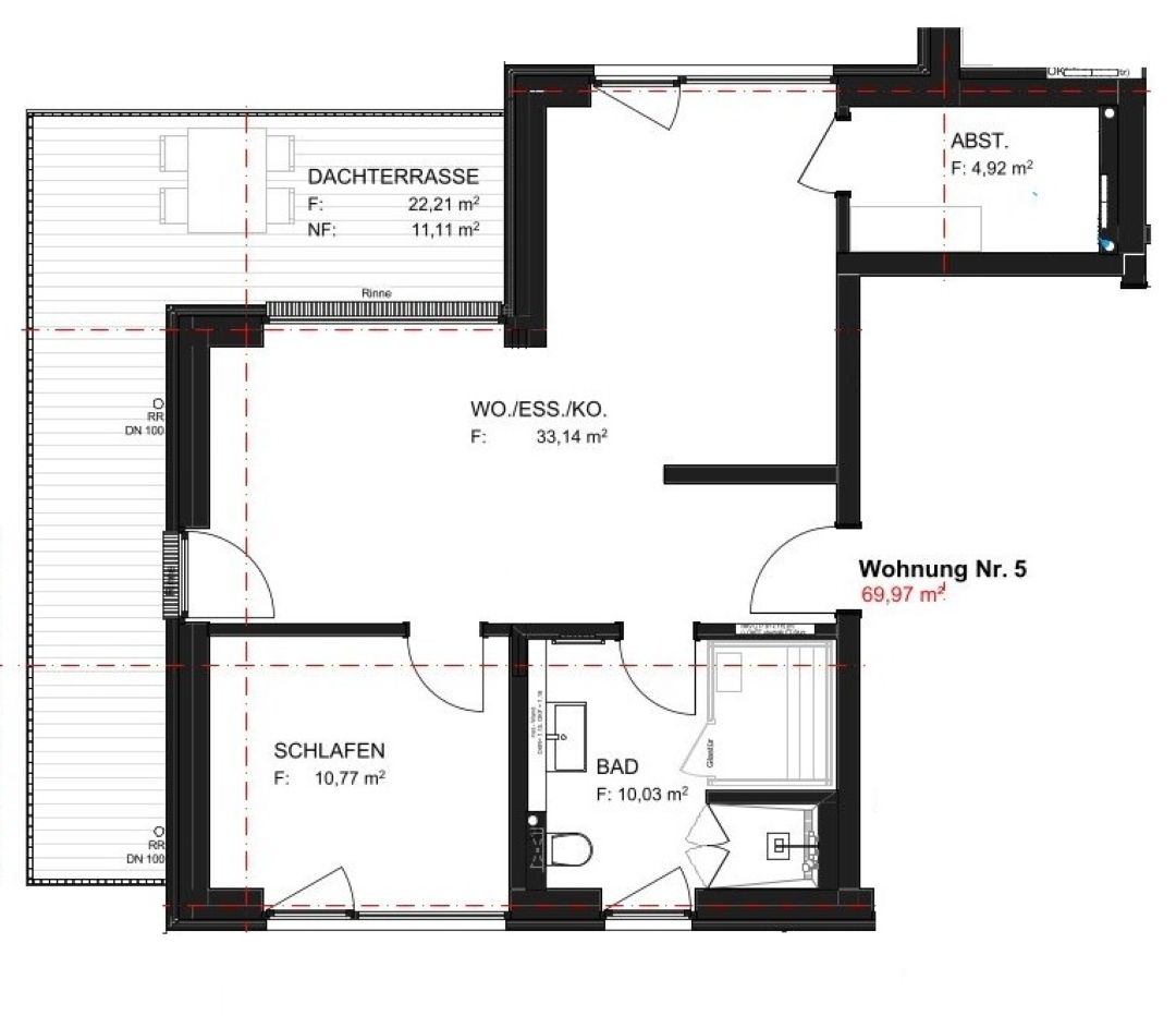 Elegantes Bad mit eigener Sauna, ebenerdiger Dusche und angenehmer Fußbodenheizung.