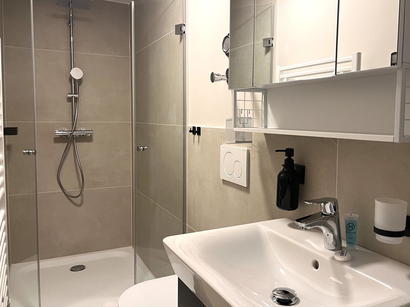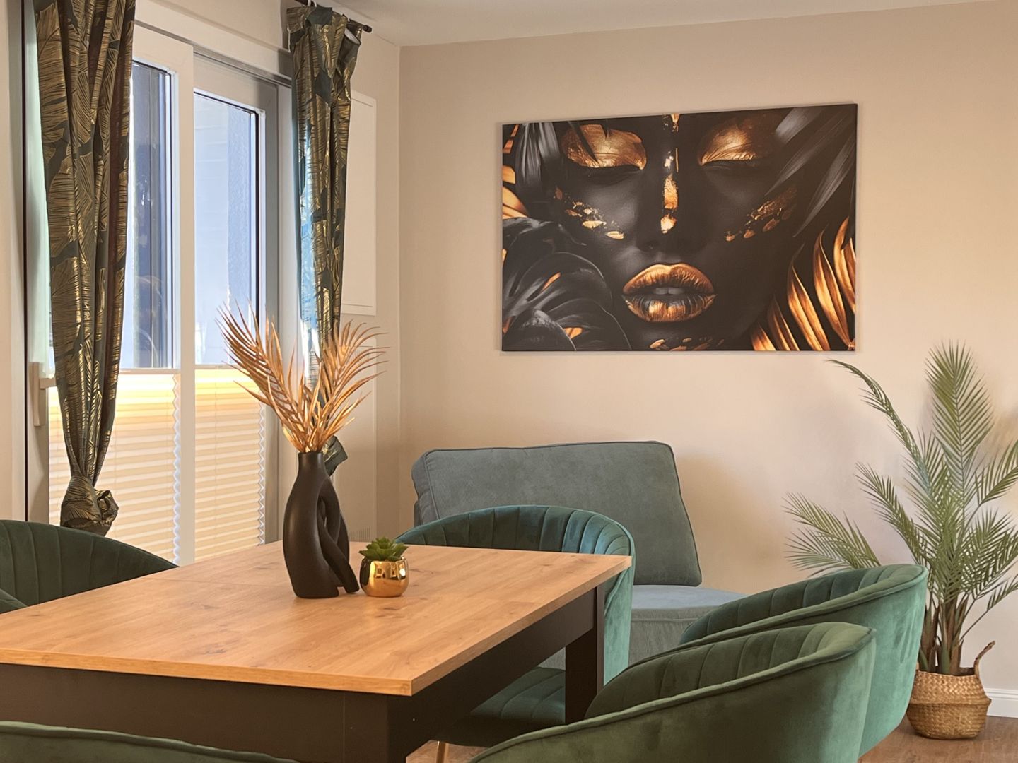 Das modern ausgestattete Appartement umfasst eine offene Küche, die an den Wohnbereich angrenzt. Hier stehen Ihnen neben einem Herd und Backofen auch Kühlschrank mit Gefrierfach, Kaffeemaschine, Wasserkocher, Toaster sowie Geschirr, Besteck und Küchenutensilien zur Verfügung. Der Esstisch bildet den zentralen Treffpunkt für gemeinsame Mahlzeiten. Im gemütlichen Wohnbereich laden ein Sofa und TV zum Entspannen ein. Ein Balkon ermöglicht Ihnen entspannte Stunden im Freien – beispielsweise mit Blick in die Umgebung.