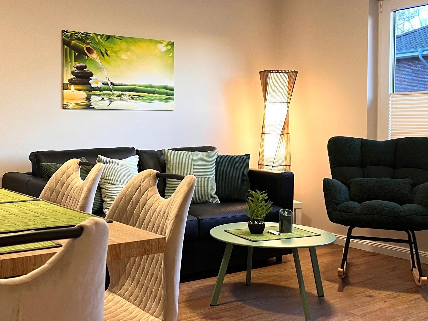 Das Appartement präsentiert sich modern und hochwertig ausgestattet. Die offene Küche geht nahtlos in das helle Wohnzimmer über und ist mit sämtlichen wichtigen Küchenutensilien ausgestattet. Dazu zählen ein Herd mit zwei Platten, Mikrowelle, Kühlschrank mit Gefrierfach, Kaffeemaschine, Wasserkocher, Toaster sowie Geschirr und Besteck. Für den Komfort auch im Alltag stehen ein Esstisch, ein gemütliches Sofa und eine Kommode zur Verfügung. Im Badezimmer erwartet Sie eine mit Wanne ausgestattete Dusche, ergänzt durch Waschbecken, Spiegel und einen Haartrockner.