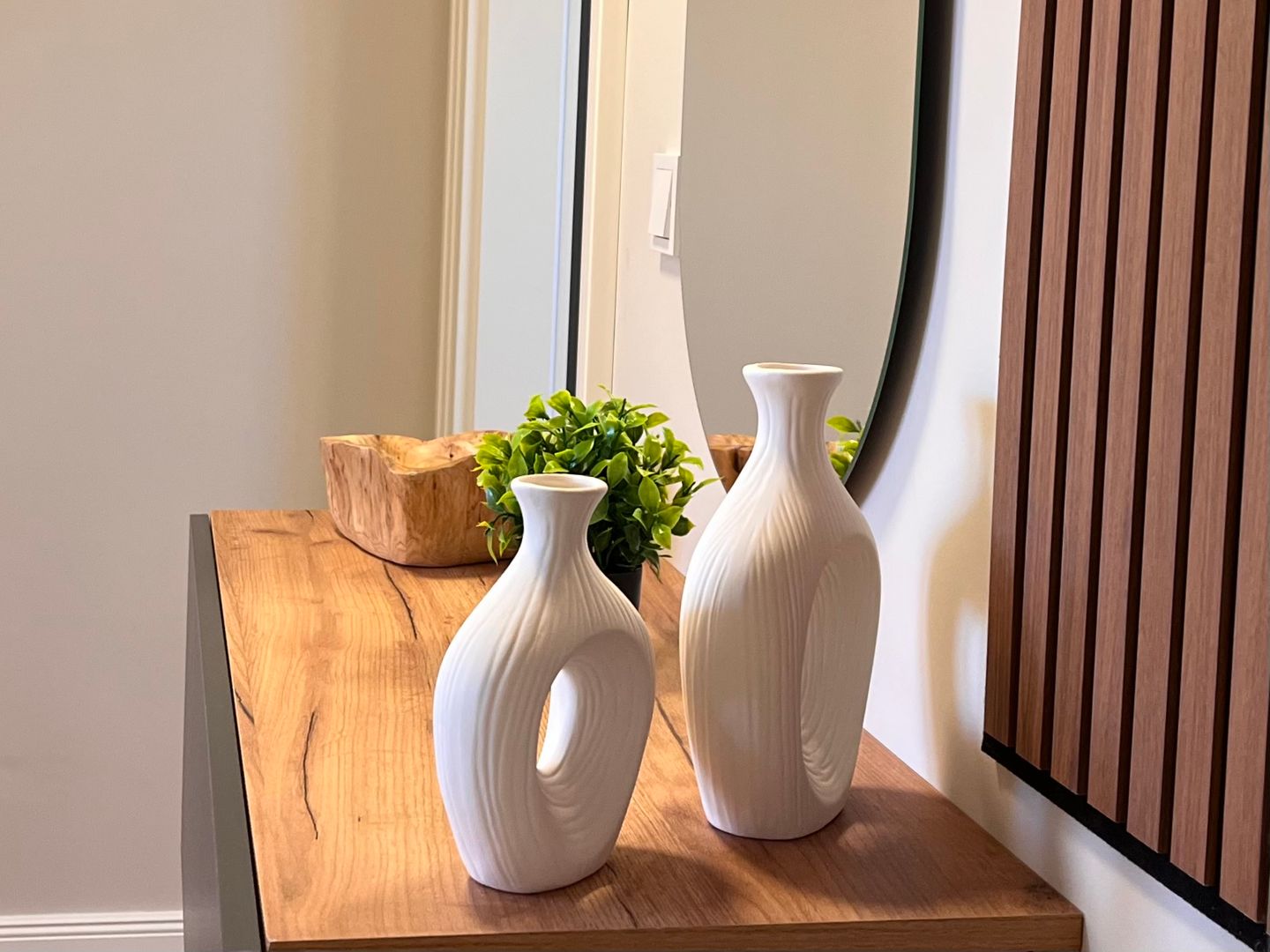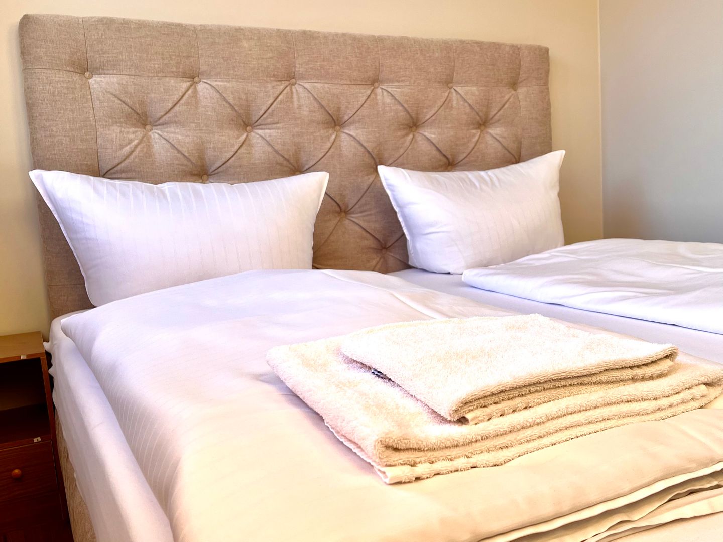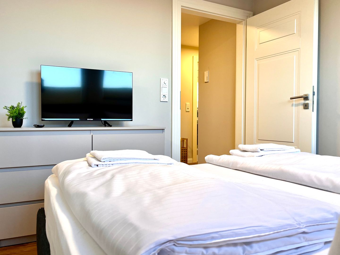 Das Penthouse verfügt über zwei separate Schlafzimmer, die jeweils mit komfortablen Schlafmöglichkeiten für bis zu sechs Personen insgesamt ausgestattet sind. Die Betten sind mit offenem Fußende gestaltet und eignen sich daher besonders gut für große Gäste. Zwei moderne Badezimmer, jeweils mit einer Dusche (davon eine mit Wanne), Waschbecken und WC, sorgen für viel Privatsphäre und Komfort. Frische Bettwäsche und Handtücher liegen bei Ihrer Ankunft selbstverständlich für Sie bereit.