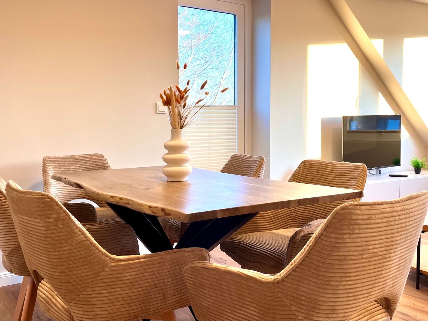 Das Penthouse ist offen gestaltet und verfügt über ein geräumiges Wohnzimmer mit moderner Sofaecke, Essbereich und direktem Zugang zur offenen Küche, die mit hochwertigen Küchenutensilien, Geschirr und Besteck umfassend ausgestattet ist. Die Küche bietet Ihnen einen 2-Platten-Herd mit Elektroanschluss, Backofen, Kühlschrank mit Gefrierfach, Geschirrspülmaschine, Mikrowelle, Toaster, Kaffeemaschine und Wasserkocher. Somit steht gemütlichen Kochabenden und gemeinsamen Mahlzeiten mit Ihren Liebsten nichts im Wege.