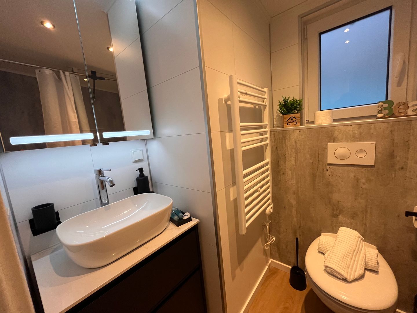 Das große, bodengleiche Duschbad wirkt modern und ist mit Haartrockner, Spiegel, Waschbecken und Fenster ausgestattet. Frische Handtücher sowie Bettwäsche gehören zur Grundausstattung, ebenso wie Geschirrhandtücher und Wäscheständer. Die Nutzung von Waschmaschine und Trockner ist gemeinschaftlich innerhalb der Ferienanlage möglich.