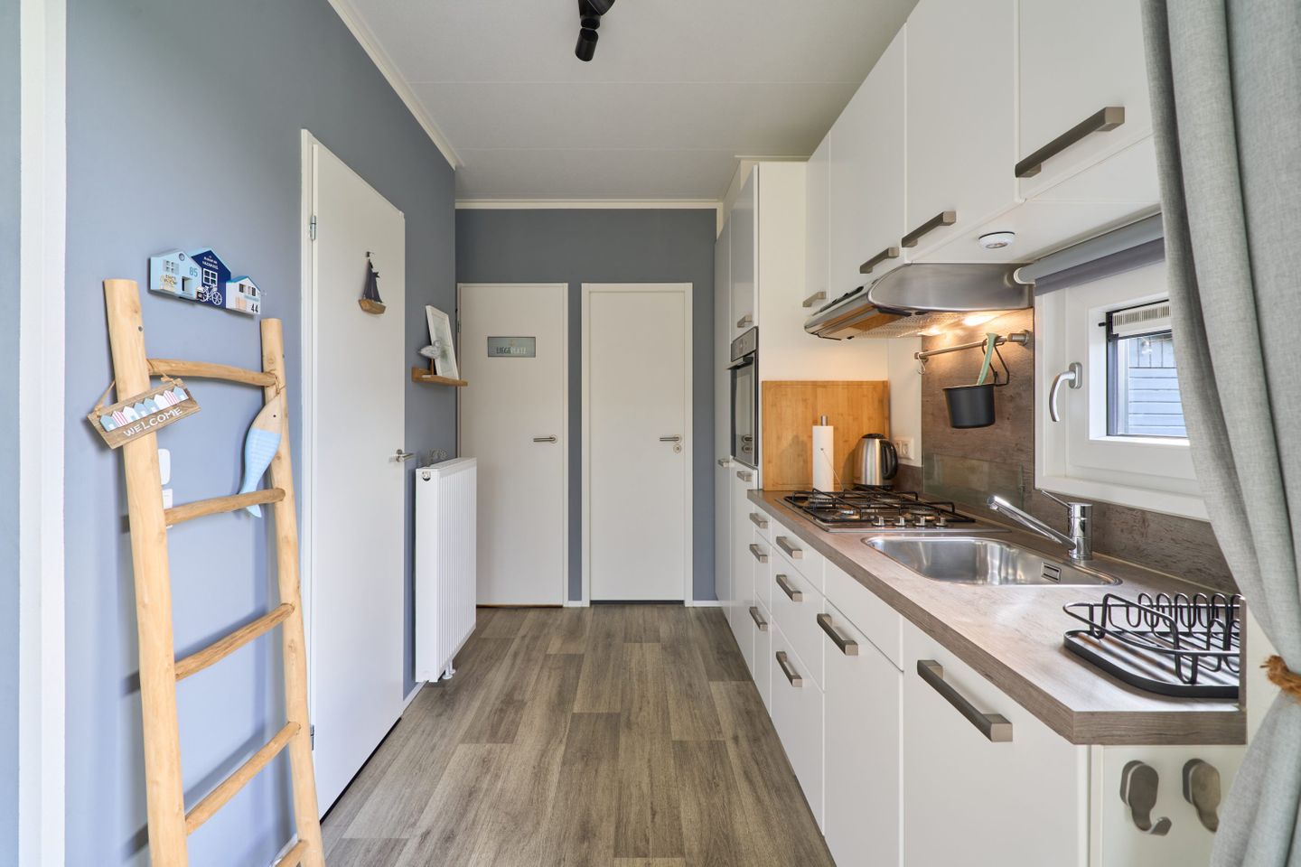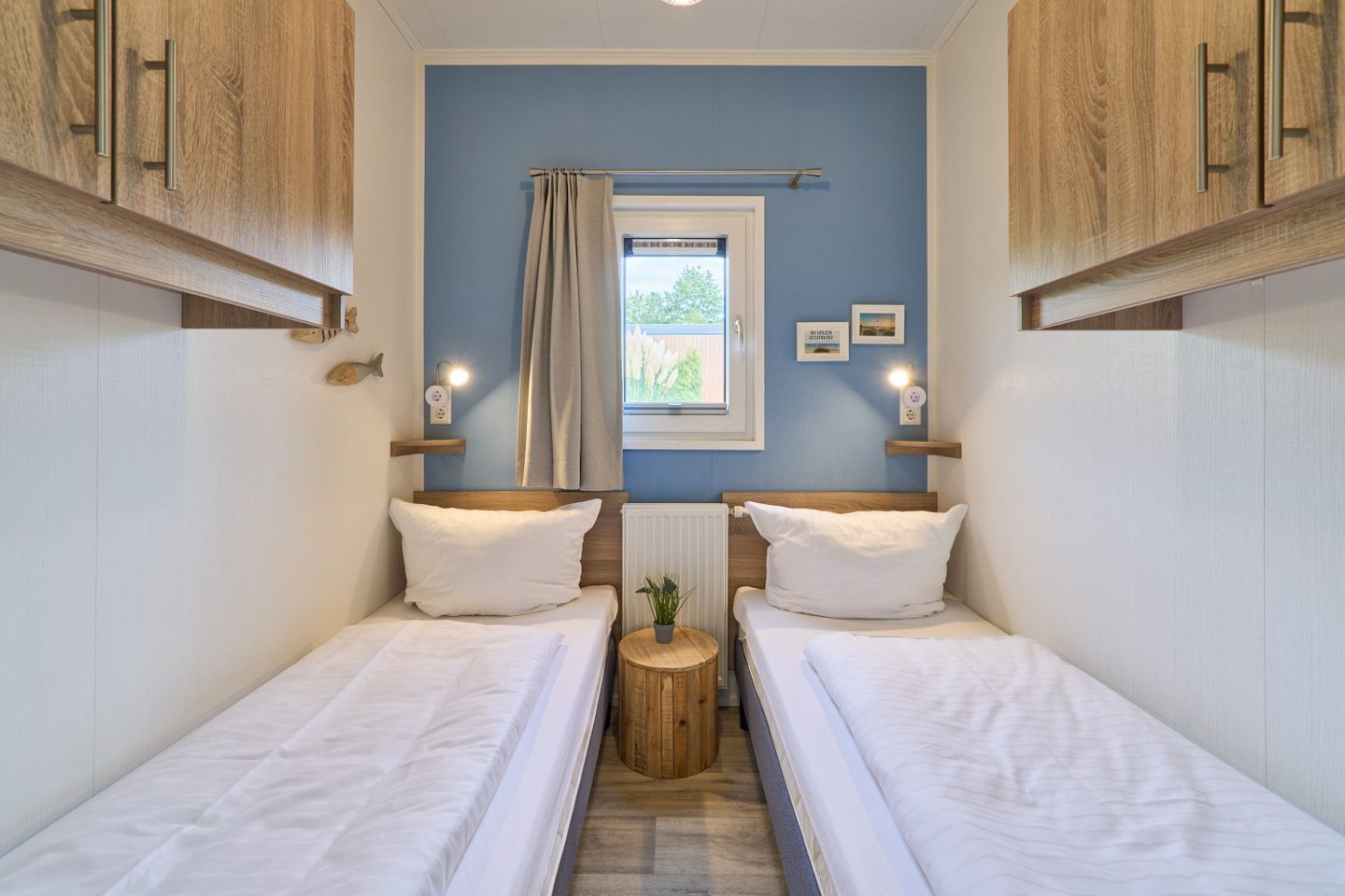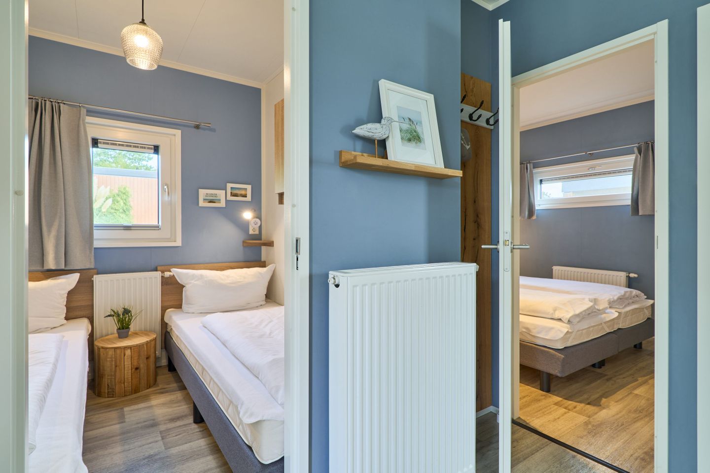 Das freistehende Ferienhaus befindet sich im Parterre, sodass ein ebenerdiger Zugang gewährleistet ist. Es verfügt über insgesamt drei Zimmer, darunter zwei separate Schlafzimmer mit Laminatboden, die insgesamt vier Schlafplätze bieten. Damit eignet sich die Unterkunft besonders für Familien, aber auch für Paare oder kleine Reisegruppen. Kinder und Babys sind willkommen, und das Haus sowie die gesamte Anlage sind familienfreundlich konzipiert. Für Sicherheit und Komfort sorgt ein Rauchmelder in der Unterkunft, und alle Fenster verfügen über einen Sichtschutz.