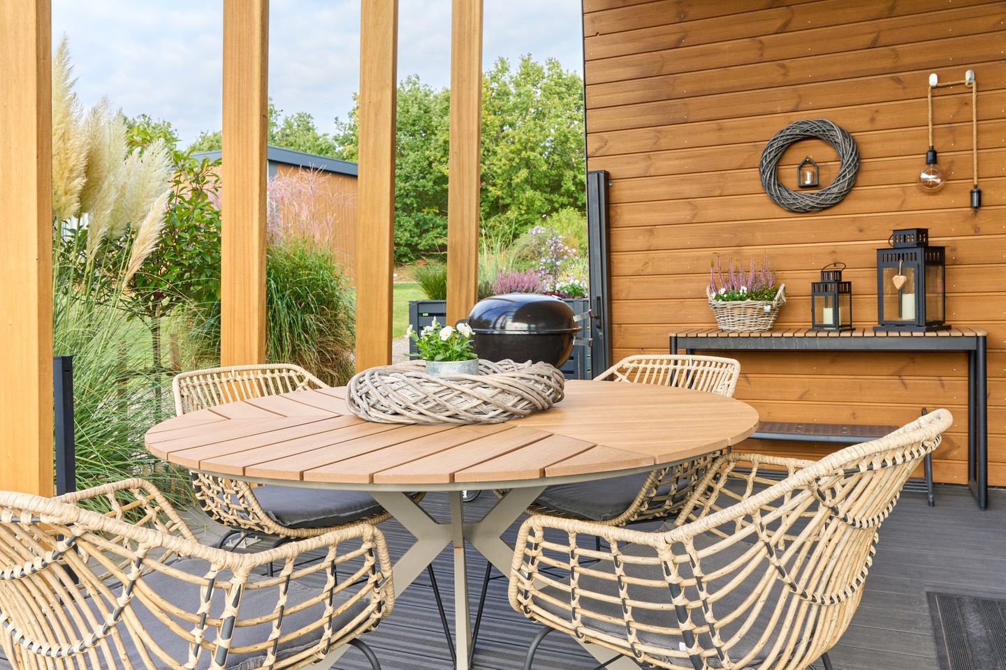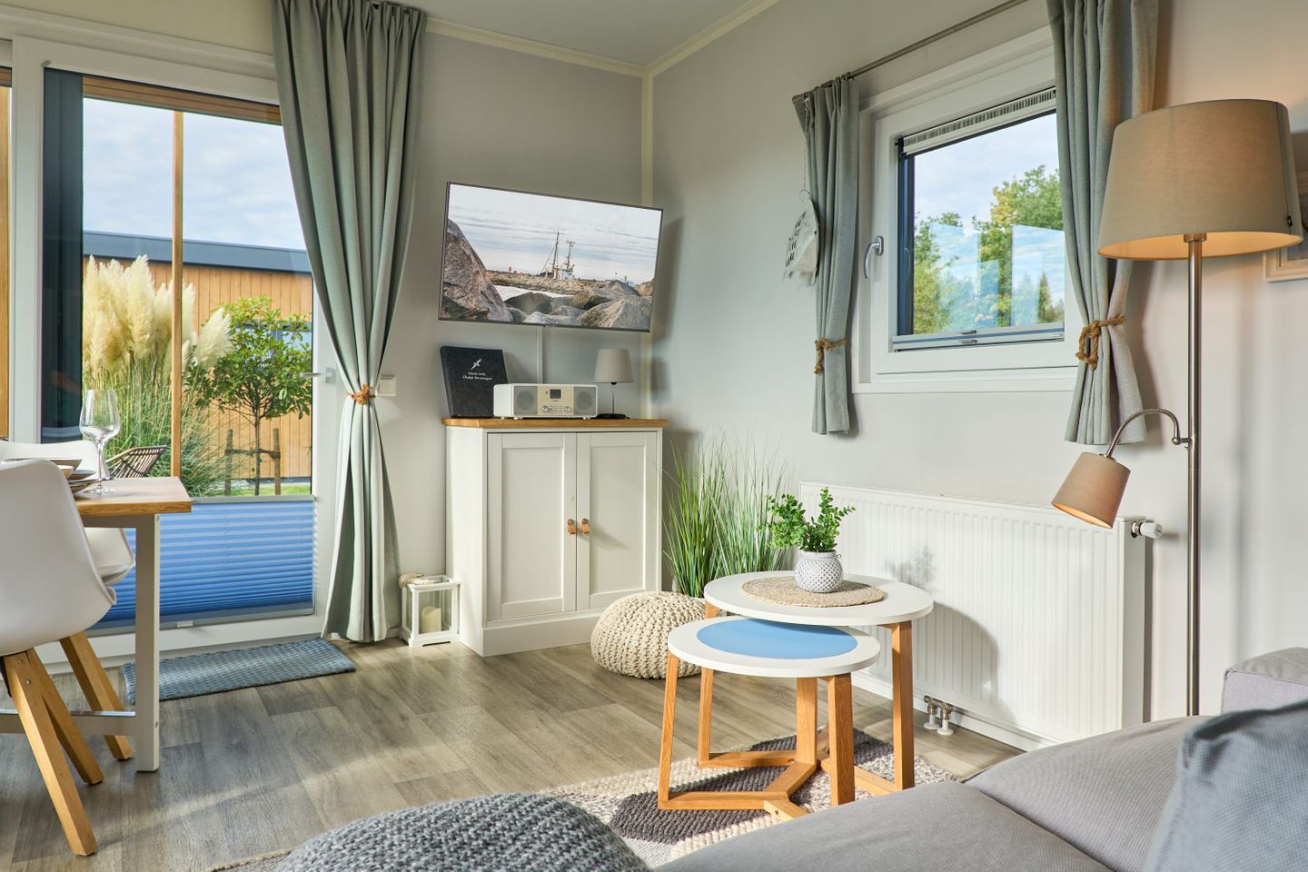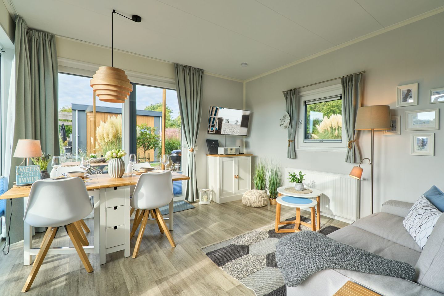 Der offen gestaltete Wohnbereich lädt mit einer gemütlichen Sofaecke, Essbereich und direktem Zugang zur Terrasse zum Verweilen ein. Die Terrasse ist mit Gartenmöbeln ausgestattet und bietet optimale Voraussetzungen für Mahlzeiten im Freien oder zum Entspannen an warmen Tagen. Im Wohnzimmer finden Sie ein Sofa, einen Fernseher (TV), ein Radio und kostenfreies WLAN, um auch während Ihres Aufenthaltes gut unterhalten und bestens vernetzt zu sein. Die moderne Küche ist zur Wohnlandschaft hin offen und lässt dank Ausstattung wie Backofen (Gasanschluss), Herd, Kühlschrank mit Gefrierfach, Mikrowelle, Kaffeemaschine, Wasserkocher, Toaster, Spülmaschine, Geschirr, Besteck und diversen Küchenutensilien keine Wünsche offen. Auch Geschirrhandtücher und ein Staubsauger werden zur Verfügung gestellt. Der separate Esstisch bietet Platz für gemeinschaftliche Mahlzeiten.